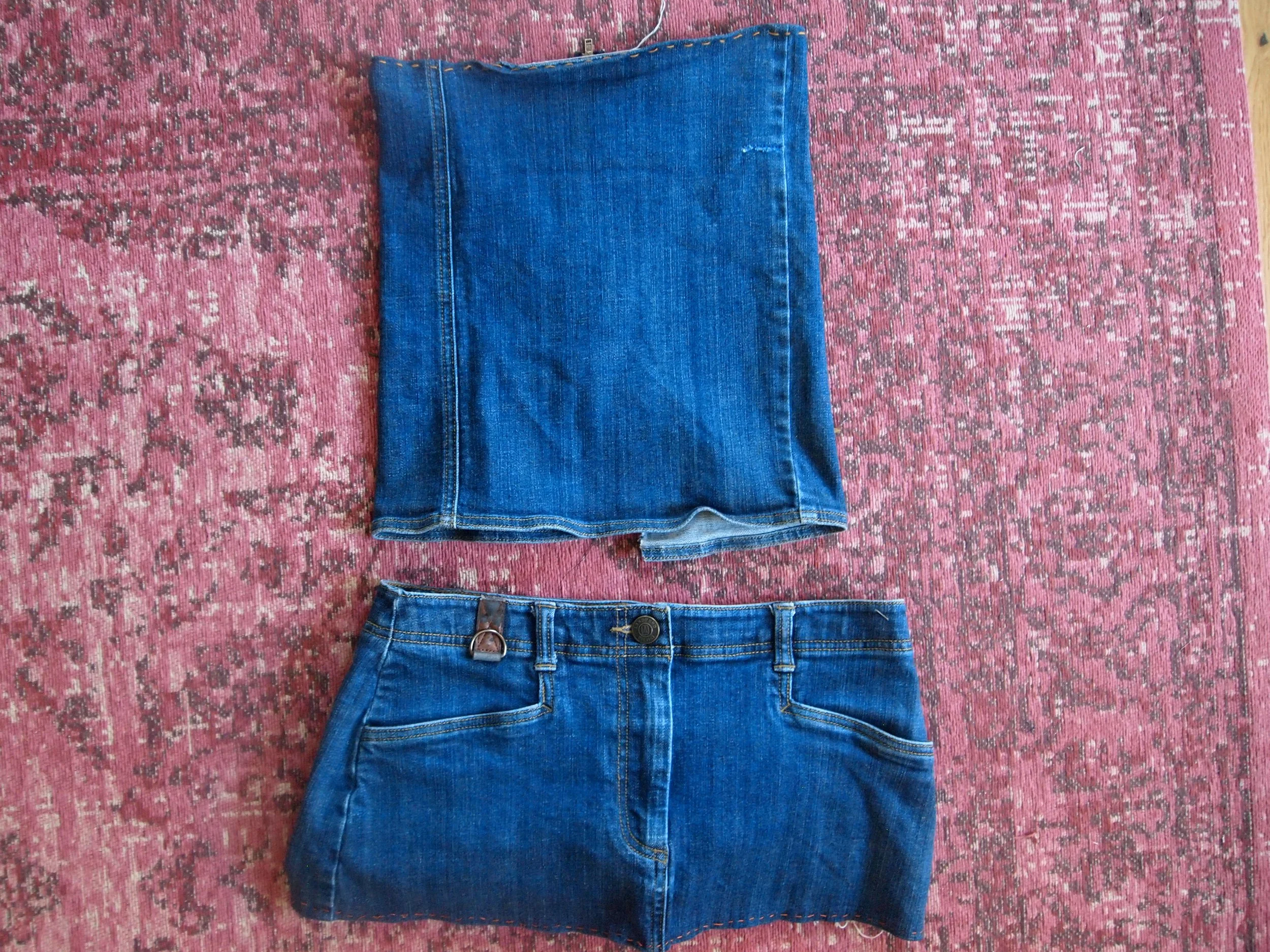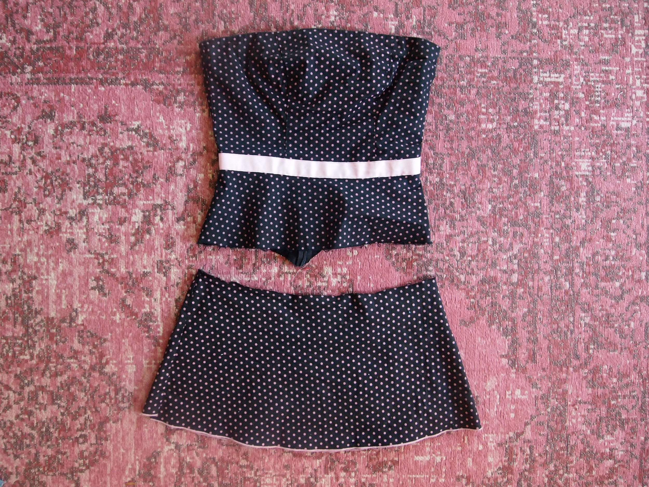 Details: Cut skirt in half; top half became mini skirt, bottom half converted into tube top with back zipper closure.