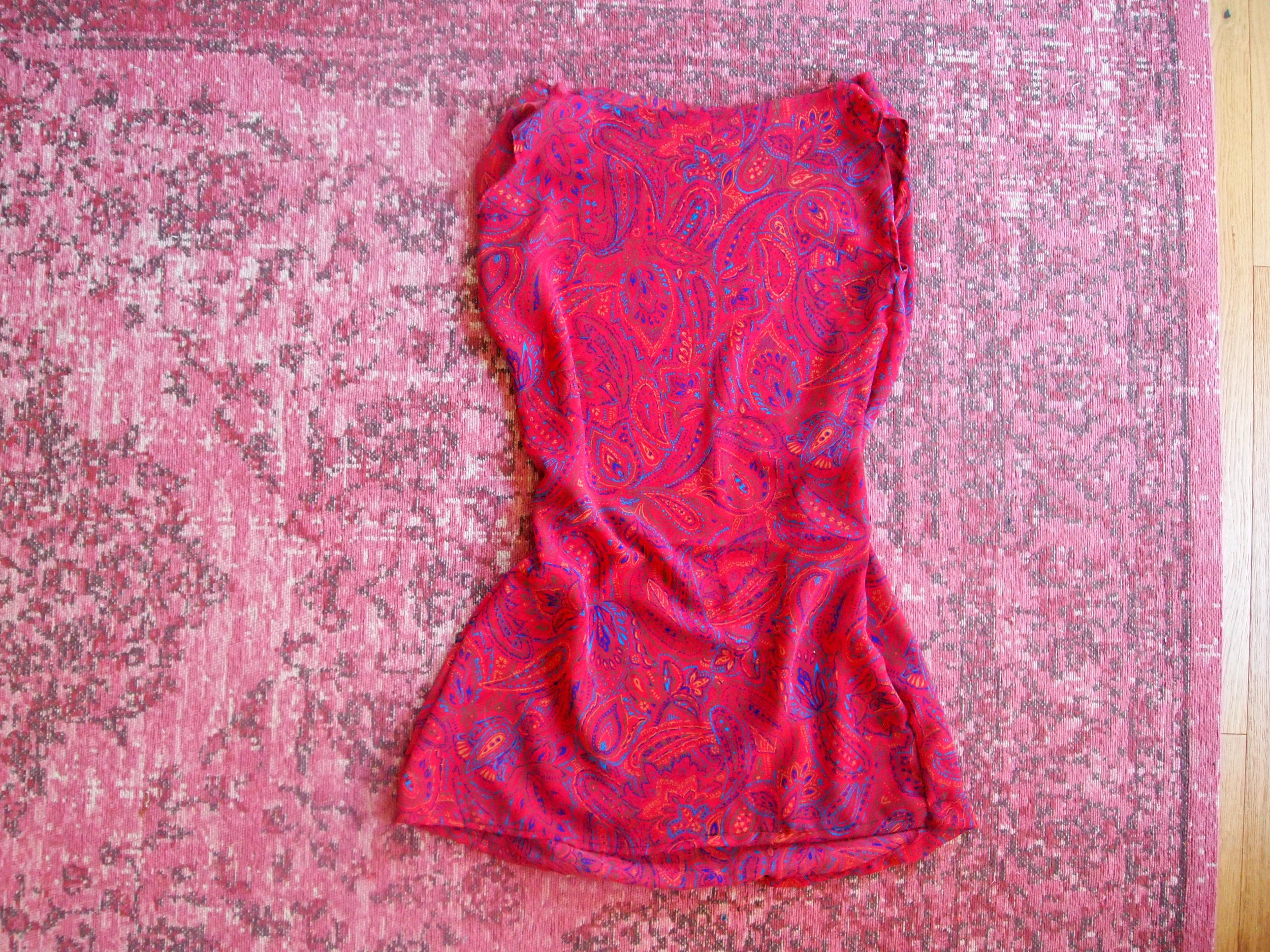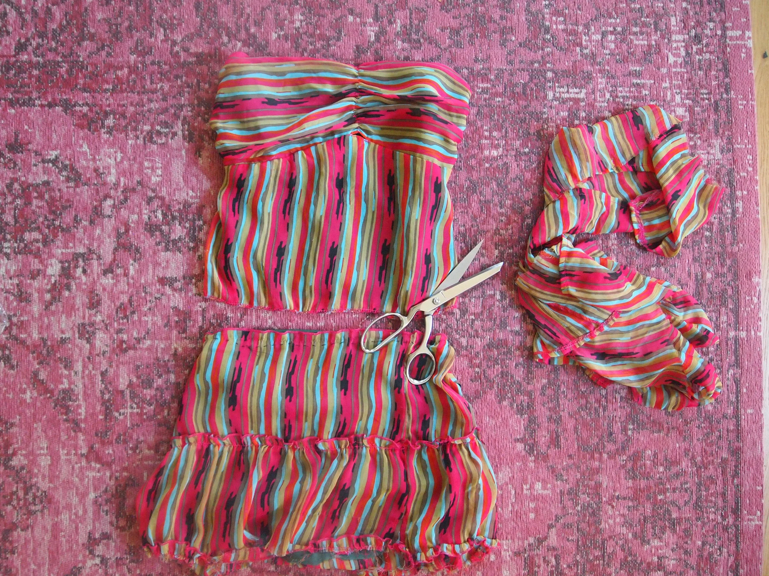 Details: Cut dress in half, hemmed edges to create matching top and bottom set.